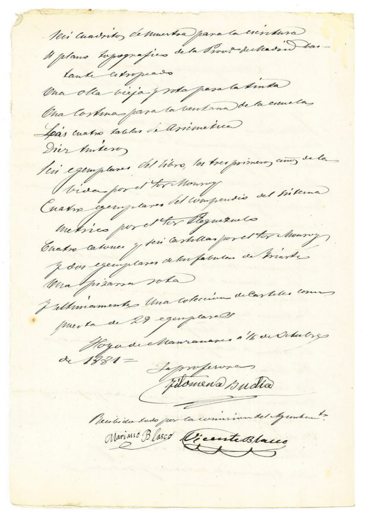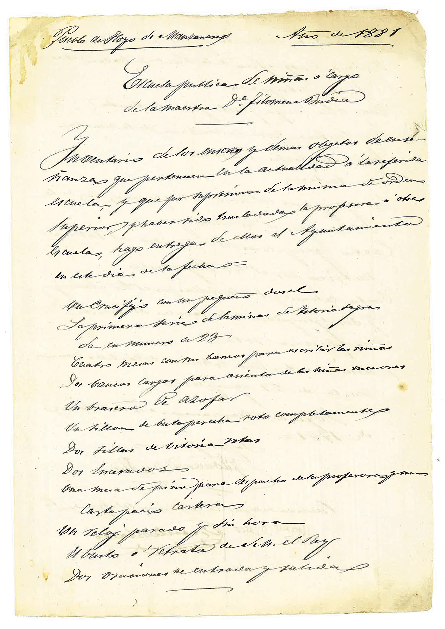 Inventario de los enseres y demás objetos de enseñanza que pertenecen en la actualidad a la referida escuela y que, por supresión de la misma de orden superior y haber sido trasladada la profesora a otras escuelas, hago entrega de ellos al Ayuntamiento en el día de la fecha: