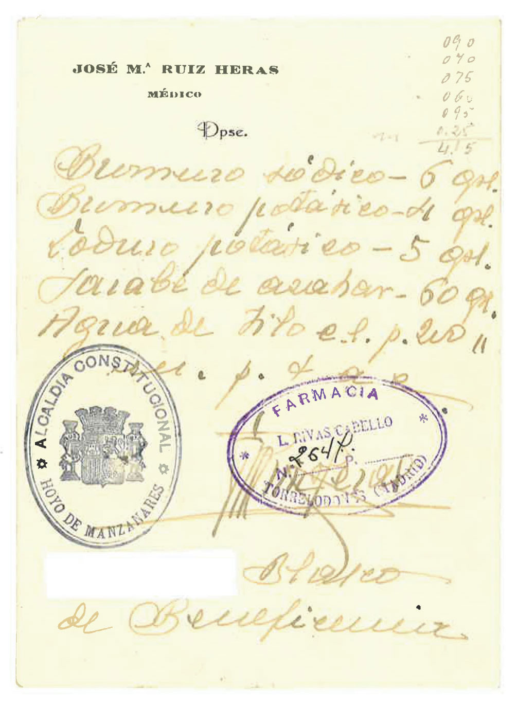 En la receta de la sra. Blasco vemos como el médico consignó en la parte de abajo el nombre de la enferma a quién iban destinados los medicamentos (se ha tapado el nombre de pila para preservar el anonimato), añadió “de Beneficencia” y estampó el sello de Alcaldía. Esto sirvió para indicar al farmacéutico (en este caso de la farmacia L.Rivas Cabello de Torrelodones), que debía dispensar de forma gratuita lo solicitado, poniendo a su vez éste el sello de su botica, para poder reclamar al ayuntamiento los gastos realizados.