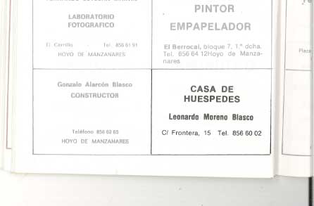 La pensión de Victorina Rosado Chantal, en la calle Frontera, nº 15 de Hoyo de Manzanares, figuraba en la publicidad como Casa de Huéspedes y a nombre de su marido, Leonardo Moreno Blasco. La inauguraron en 1970, años después del Bar restaurante Canales, en la Calle Juan Carlos I, nº 1, que abrieron en 1967.